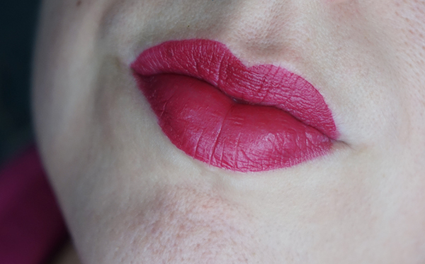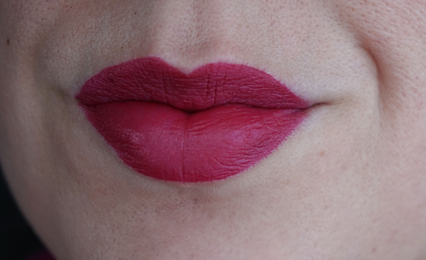Este tom é tão bonito! É um vinho, mas claro. Repararam como os lábios ficam mais lisos? Adorei esta textura, é MA-RA-VI-LHO-SA! A cor é intensa e deixa o lábio bem definido. Amei! Este batom é super, hiper, mega fácil de aplicar, não risca e cobre perfeitamente todo o lábio.